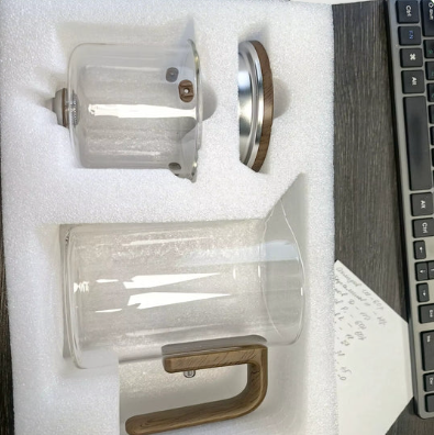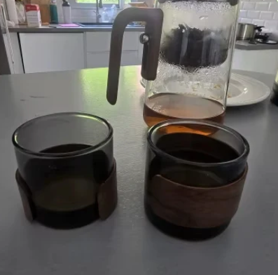 Elegancki, drewnopodobny uchwyt jest zawsze chłodny w dotyku, zapewniając bezpieczne i pewne nalewanie gorącego napoju w biurze lub domu.